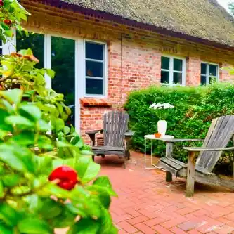 - Detailfotos vom Reetdach (Dachkanten, Giebel, Fensterläden)